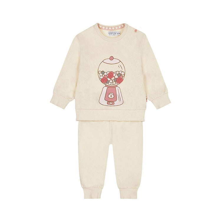Lascia che la tua piccola brilli con questo comodissimo e super carino completo! Il completo Dirkje bianco sporco è composto da un morbido maglione per bambine in 100% cotone con un allegro distributore di gomme da masticare sul davanti. I pantaloni della tuta coordinati hanno elastico in vita e elastico alle gambe per un comfort extra e una vestibilità perfetta. Scegli un look giocoso e comodo!